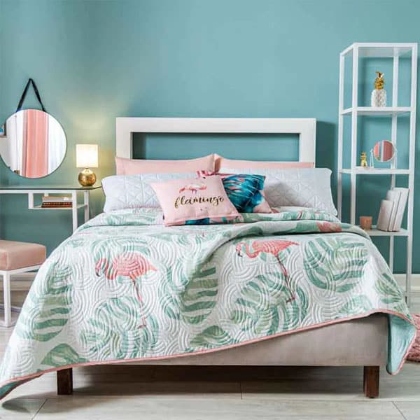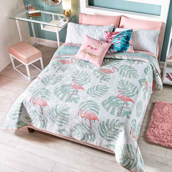 Lleva hasta tu habitación el tema en tendencia de los flamingos, que por su colorido en tonos menta y rosa dan a tu habitación un toque divertido y moderno. Edredón estampado con segunda vista lisa. Ultra delgado con capitonado especial. Muy ligero