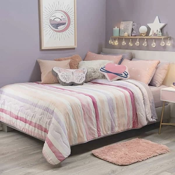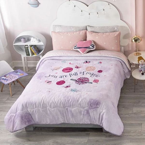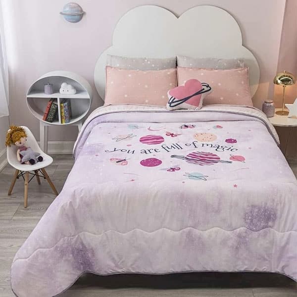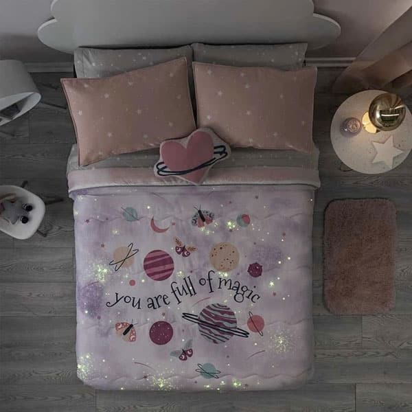 Juego de edredón con especialidad de tinta que brilla en la oscuridad en primera y segunda vista. Suave por su textura viasoft. Delgado lo que lo hace ligero y fácil de lavar y de guardar. Incluye fundas decorativas estampadas y 1 cojín de forma.