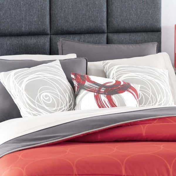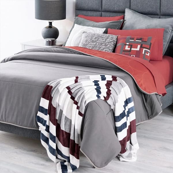 Si lo que quieres es hacer relucir tu habitación, el edredón Ferrara es para ti, gracias a su vibrante color rojo en combinación con el gris, tendrás un ambiente equilibrado y ese toque de moda con su estampado geométrico.