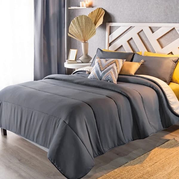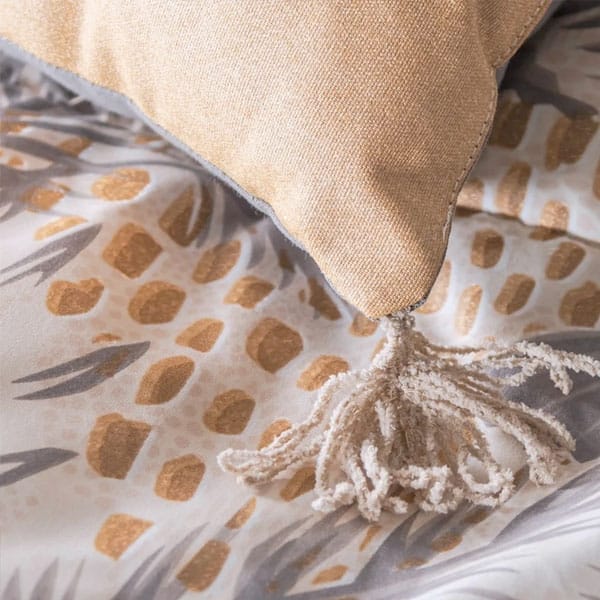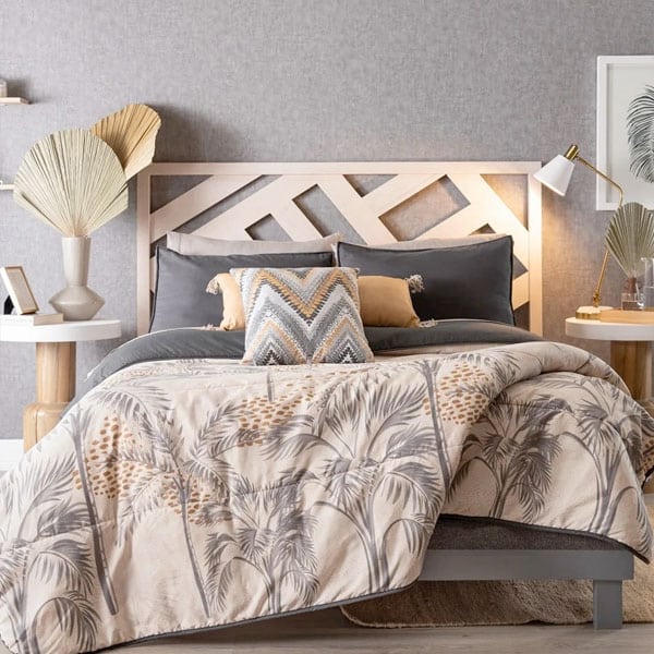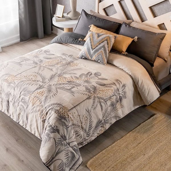 Su diseño cuenta con un estampado de palmas de estilo tropical y detalles en tinta dorada. Su paleta de colores neutros mantiene la estética de la decoración de tu dormitorio.