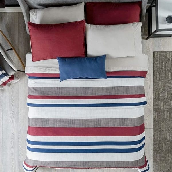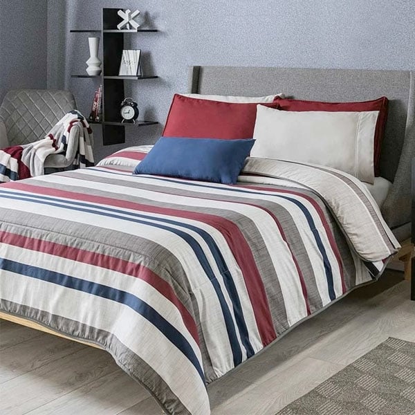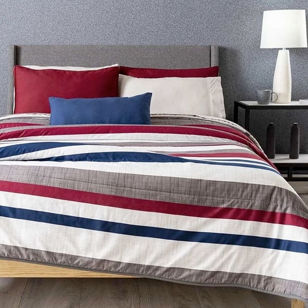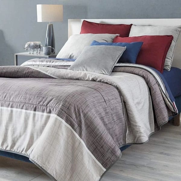 Edredón inspirado en el espíritu urbano de las grandes ciudades. Este diseño le dará un toque gráfico a tu recamara, se imprimieron texturas sobre las franjas de color rojo y gris.