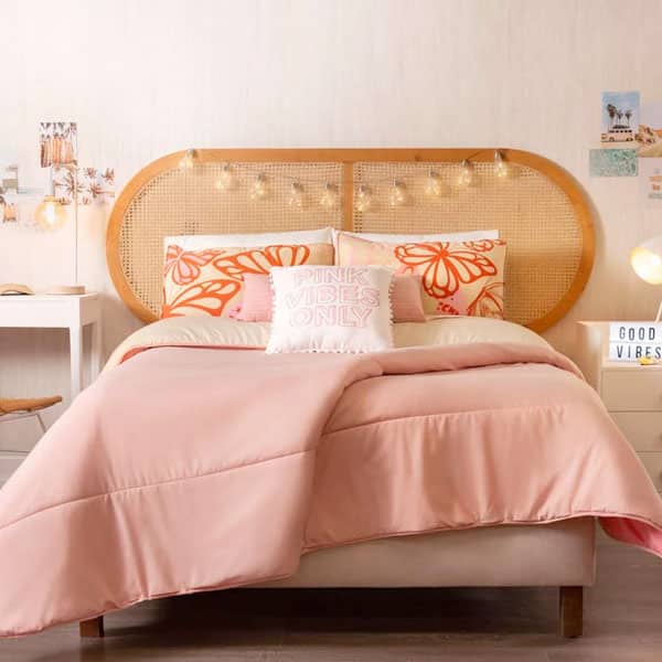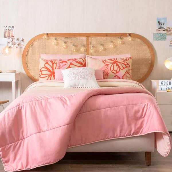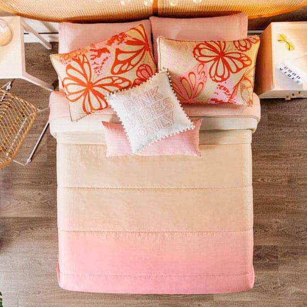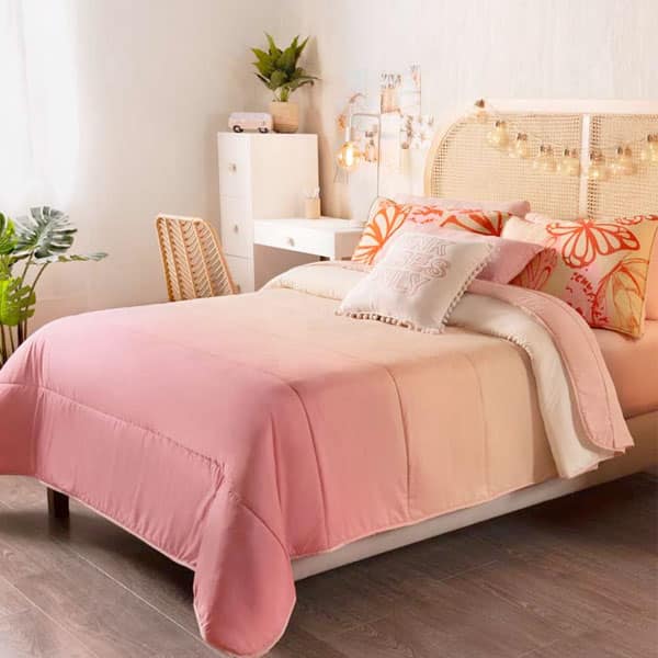 Juego de edredón doble vista. Suave por su textura viasoft. Delgado lo que lo hace ligero y fácil de lavar y de guardar. Incluye fundas decorativas estampadas, 1 cojín con pompones y 1 cojín estampado.