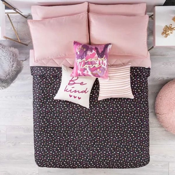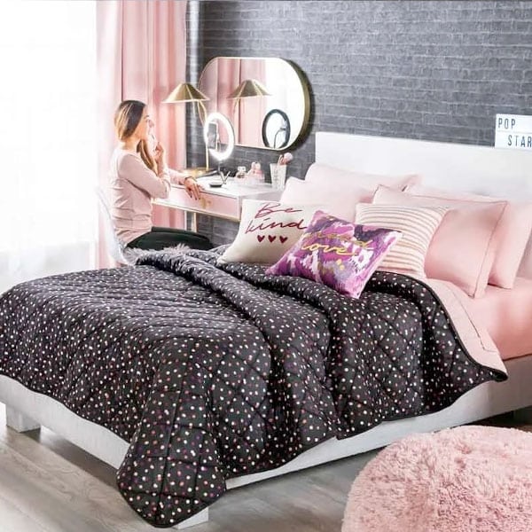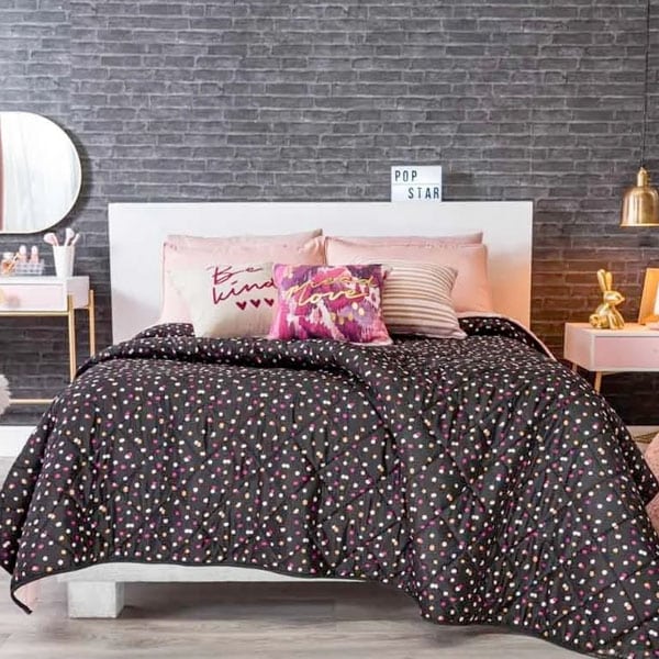 Juego de edredón doble vista. Suave por su textura viasoft. Delgado lo que lo hace ligero y fácil de lavar y de guardar. Incluye fundas decorativas estampadas, 1 cojín con tinta metálica y 2 cojines estampados.