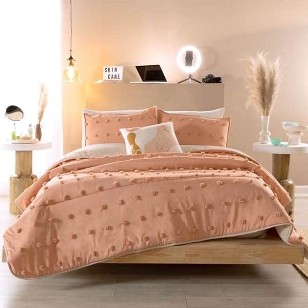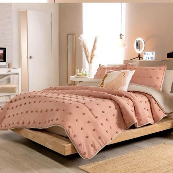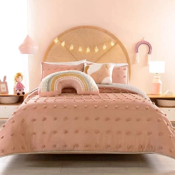 Juego de edredón con especialidad de pompones en la primera vista. Suave por su textura viasoft. Incluye fundas decorativas con pompones y 1 cojín estampado.